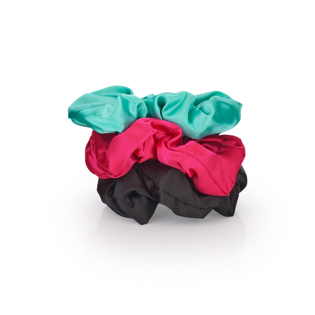 Add a splash of colour to your routine with the Cloud Satin Scrunchie Set in Aqua Black. Featuring three oversized scrunchies in bold aqua, striking scarlett, and timeless black, this trio is a must-have for effortless, hair-friendly styling.