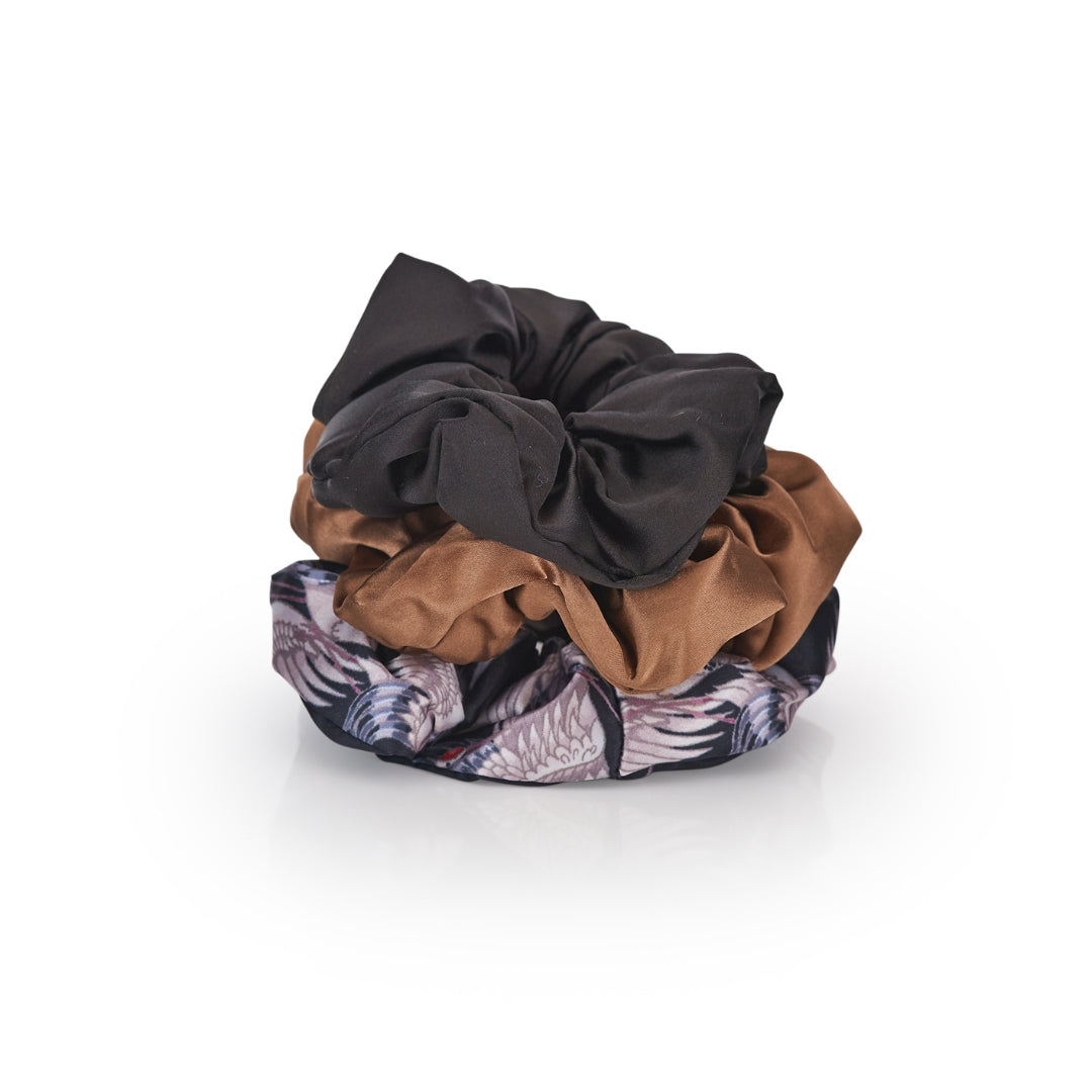 Bring an effortlessly chic vibe to your haircare routine with the Cloud Satin Scrunchie Set in Moonlit Mocha. This trio features one scrunchie in our graceful Moonlit Cranes print, one in rich mocha satin, and one in classic black – perfect for day-to-night styling.