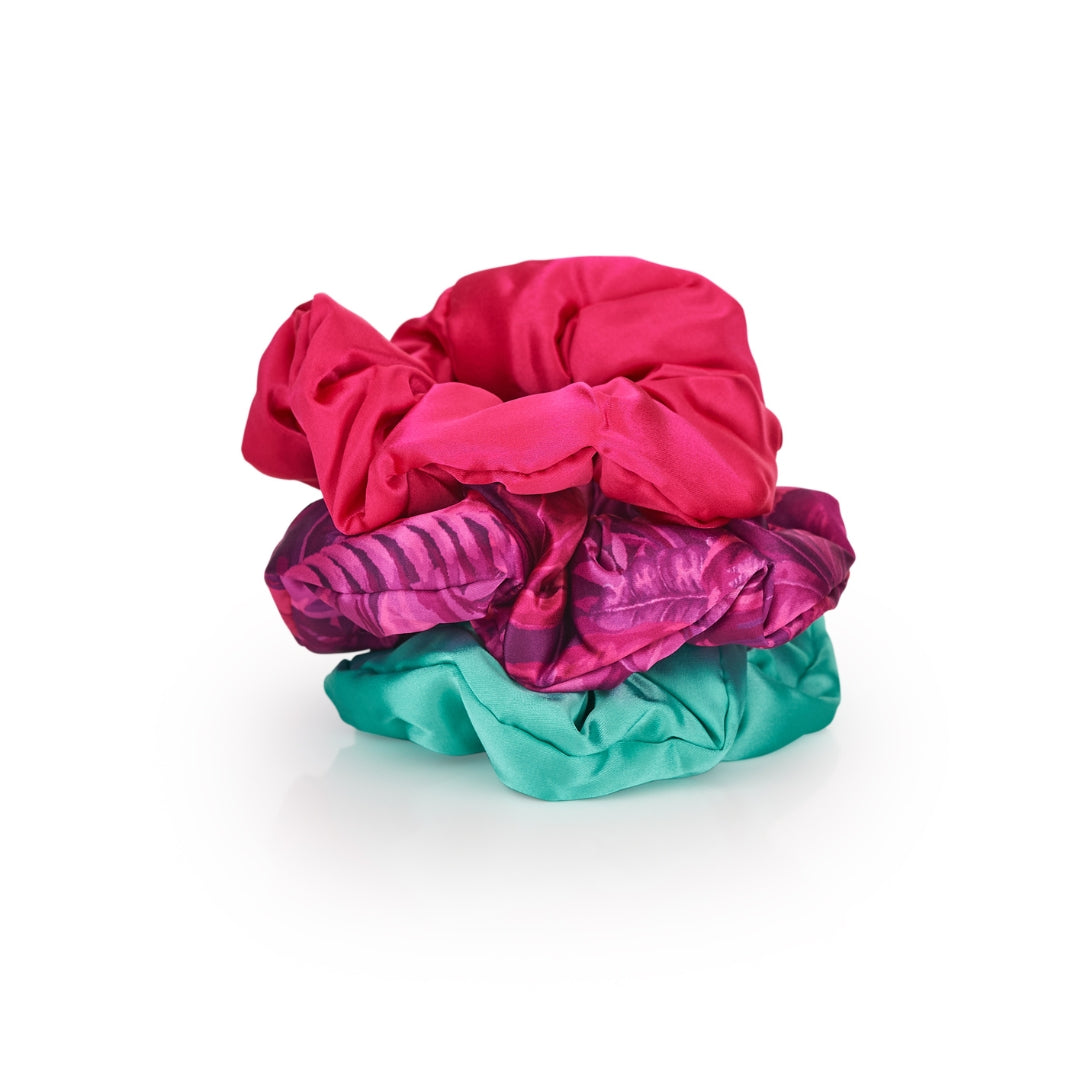Bring a pop of paradise to your ponytail with the Cloud Satin Scrunchie Set in Scarlett Fern. Featuring three vibrant scrunchies – bold scarlett red, aqua blue, and a rich pink fern print – this set adds colour and confidence to your everyday styling.