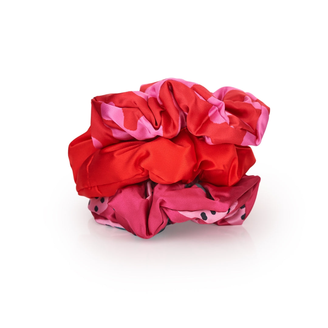 Turn up the fun with the Cloud Satin Scrunchie Set in Strawberry Leopard. This vibrant trio features one scrunchie in our juicy Strawberry Dreams print, one in bold Red Leopard, and one in vivid strawberry red satin for a look that’s playful, punchy, and full of personality.