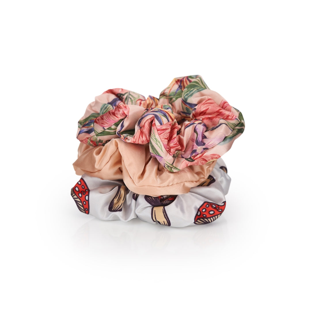 Step into your fairycore era with the Cloud Satin Scrunchie Set in Toadstool Paradise. This soft, playful trio features one scrunchie in our sweet Toadstool print, one in tropical Flamingo Paradise, and one in warm caramel satin – the perfect mix of fun and understated.